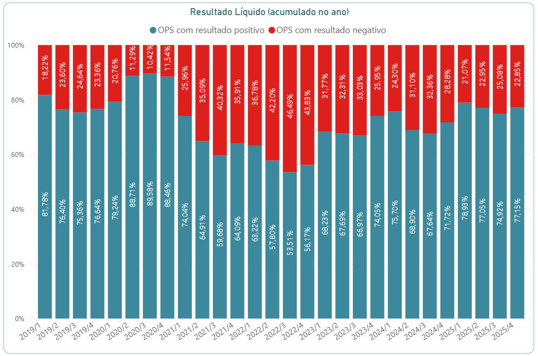 Como resultado dos movimentos apresentados, o ano de 2025 se encerra com 77,1% das operadoras apresentando resultados positivos. Este é o melhor percentual de empresas no “azul” dos últimos 5 anos.